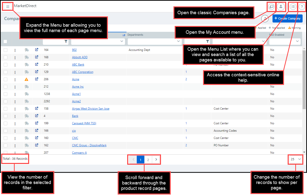 ● The image below shows the Manage Companies page (completely redesigned for v. 11.6) with call-outs describing various elements.
