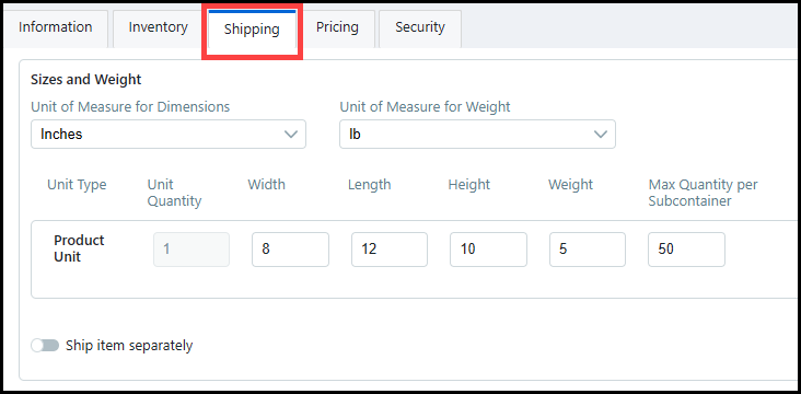 ● Unit: Select the unit of measurement for the warehouse: Inches, Feet, and Centimeters.