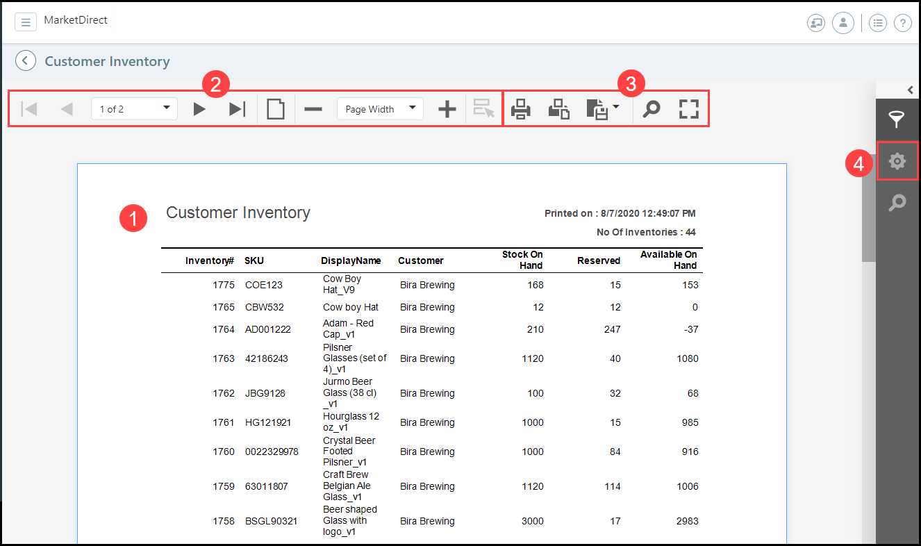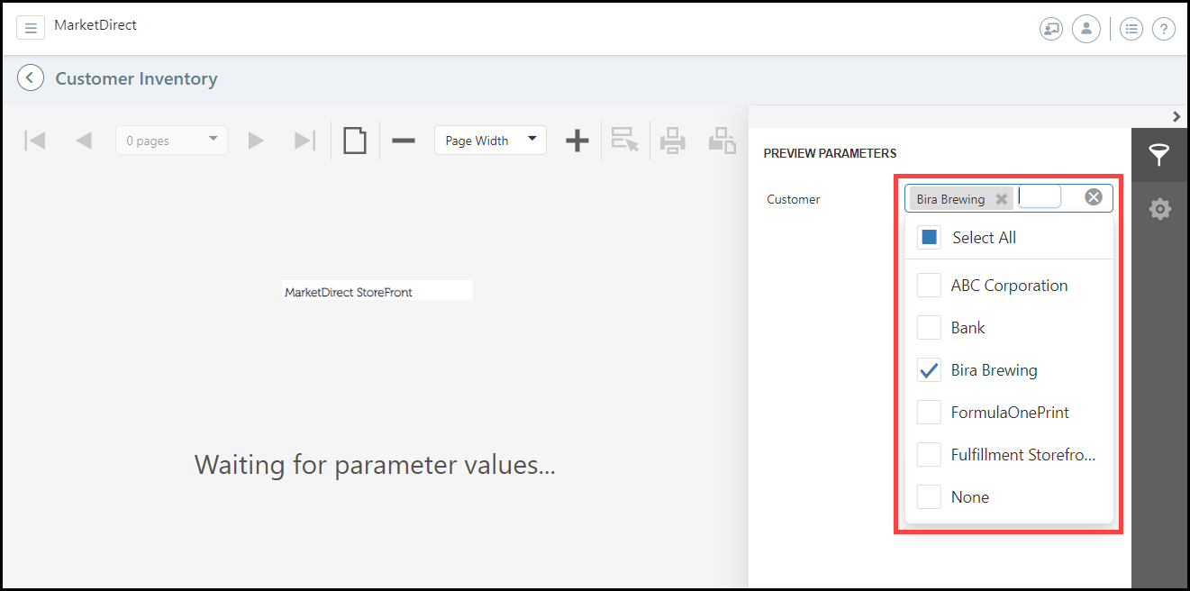 ● The Customer Inventory report has a required Customer parameter. These parameters may change depending on the report. In the PREVIEW PARAMETERS fly-out window:
