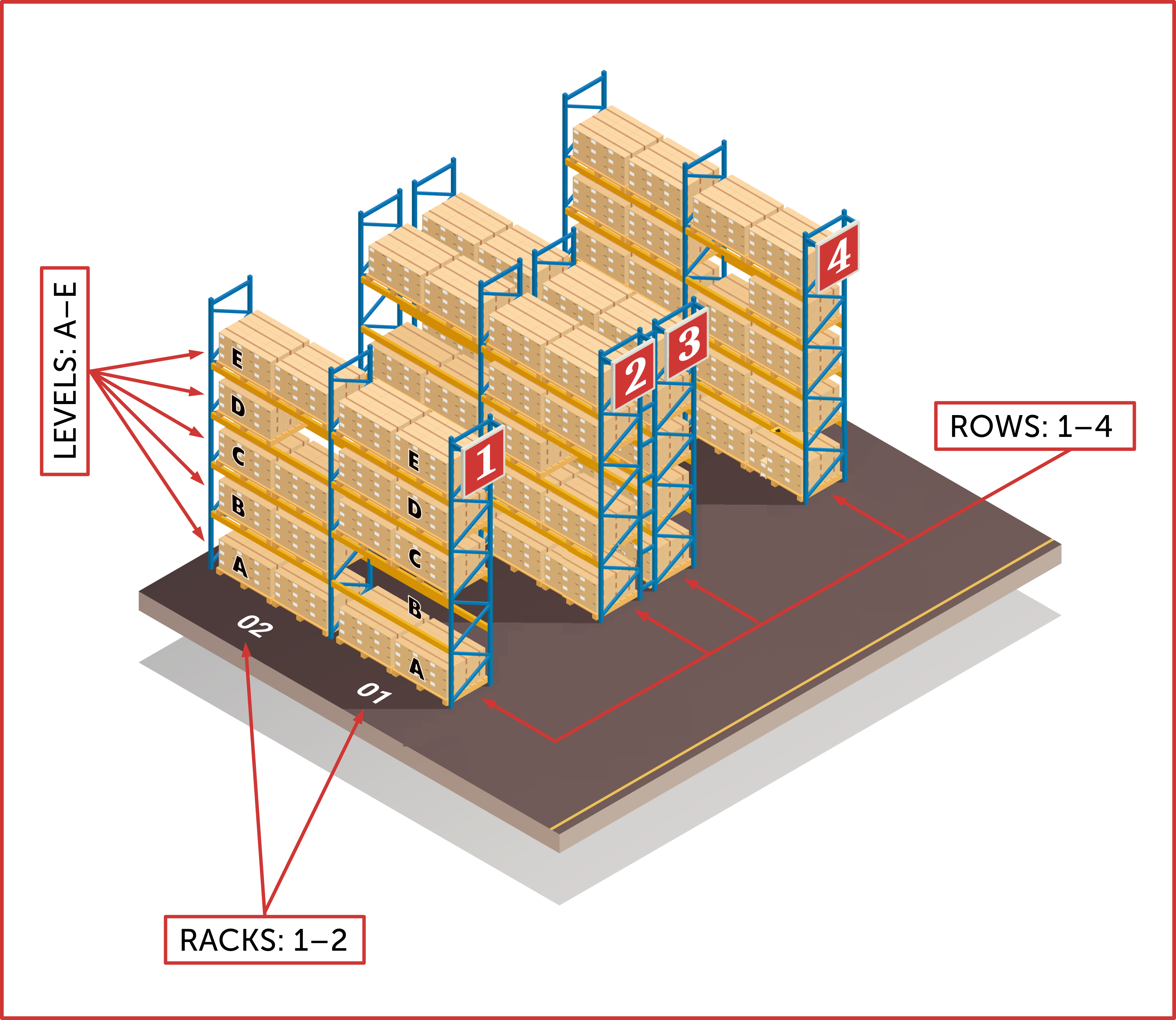 with locations in Rows (or Aisles), Racks (or Bays),