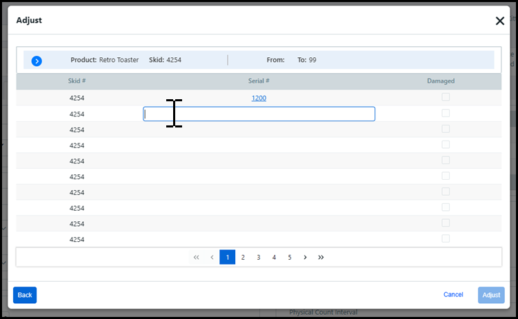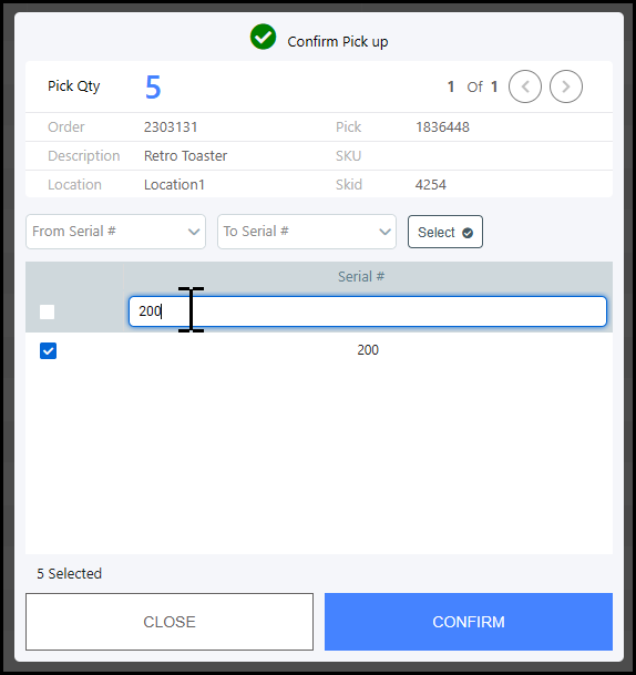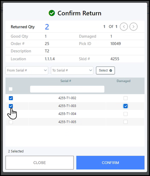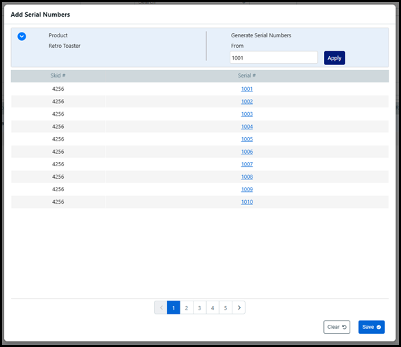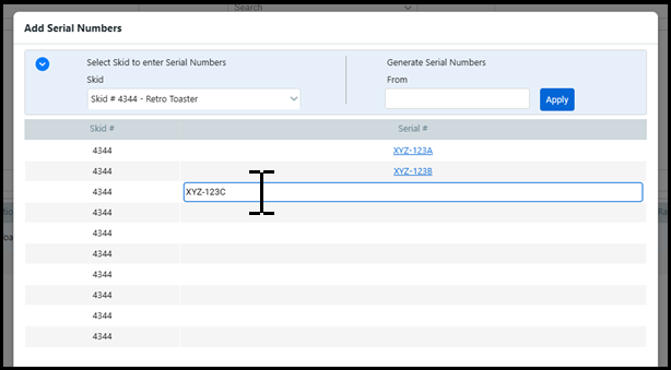 7 Choose the appropriate skid from the Select Skid to enter Serial Numbers drop-down list.