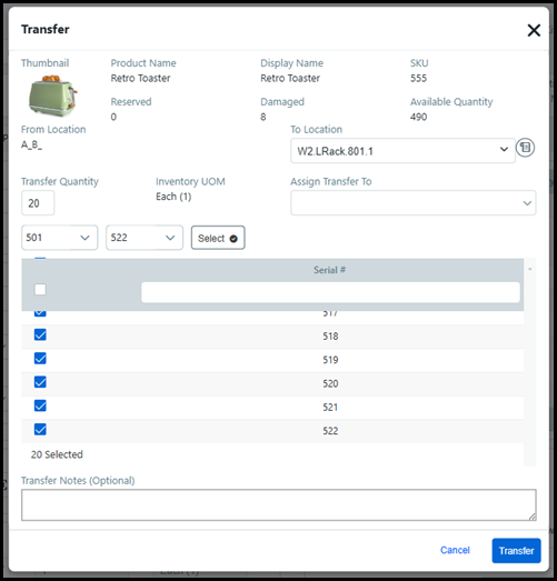 Serial numbers must be tracked during any interaction with serialized products. There are three common ways to select a serial number from the Serial Number table.