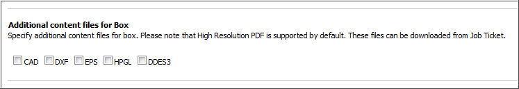 ● In the Additional content files for Box section and specify the file formats you will support for box products: