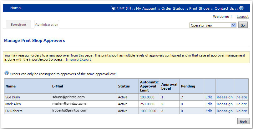 Follow the steps in this section to manage approvers associated with the Print Shop or company. If you are using a single-level (rather than a multi-level) approval process, you can add the approver following these steps. To configure a multi-level approval process for price or product approvals (or both), use the Import / Export functionality. See the Importing and Approvals help topics for more information.