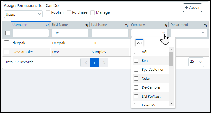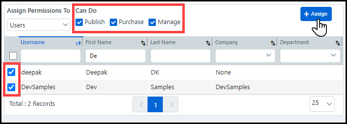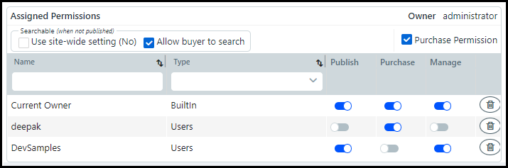 Enable or disable the Publish, Purchase, and/or Manage rights of Assigned user(s) and/or group(s) by using the appropriate toggles.