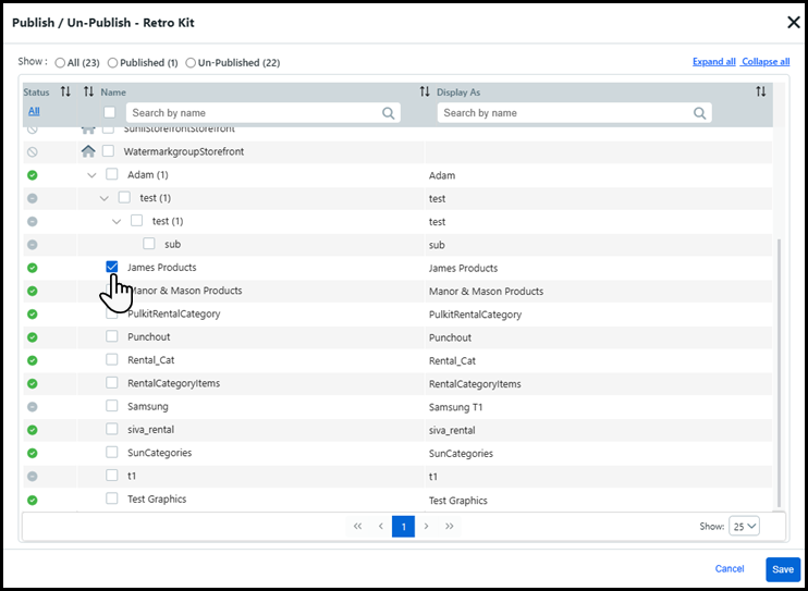 4 Select the storefront(s) and category(ies) to which you want to publish the product in the Publish/Un-Publish window.