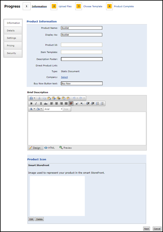 Note for entity administrators: You can use the copy product feature to create new ad hoc and SmartCanvas products. After copying a product and saving it with a new name, you will find that all of the settings for the copied product are carried into the new product except security and inventory settings (which will have the default values that you can change as needed to suit the needs of the new product).