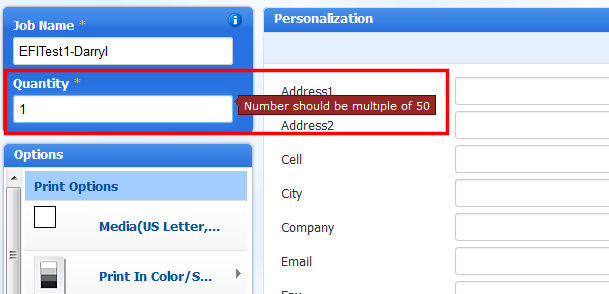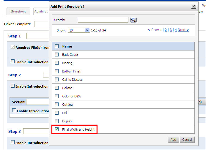 ● When ordering wide format products, buyers will be required to enter final width and final height to proceed with order placement when ordering a continuous Media product. The Final Width & Height print service must be available on the ticket template (see Ticket Templates for more information). Some large format products will be in fixed sizes (such as 4’ x 8’) and will not need the final width and height. The product may set defaults or restrictions on the final size).