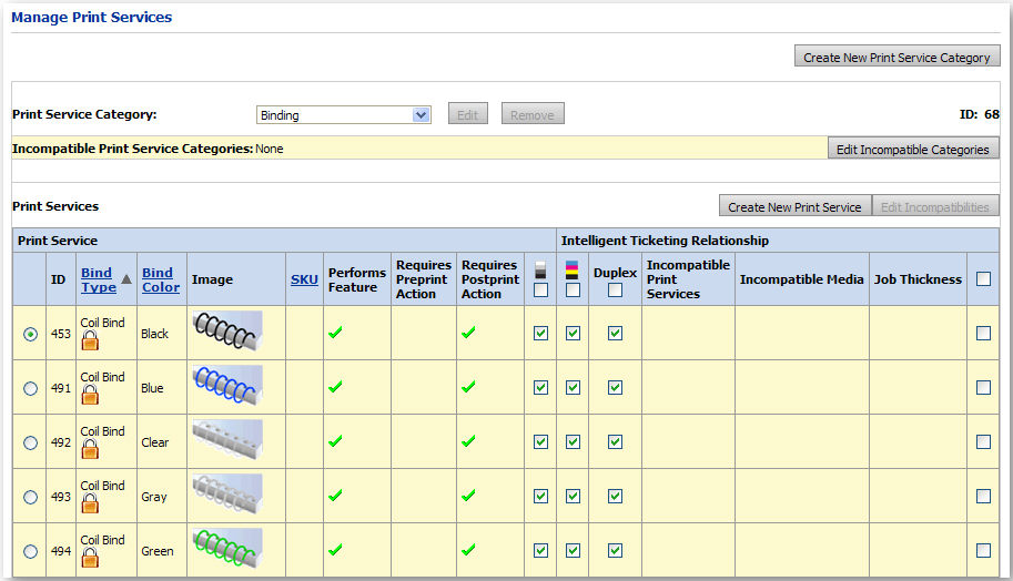 When you create a new category, add a default print service with wording such as “None” or “No” and do not select the Performs Feature checkbox. For example, if you add a new category called “Stacking,” create a print service called “No Stacking.” This allows you to select “No Stacking” as the default for a job; otherwise, some type of stacking would be selected for each ticket.