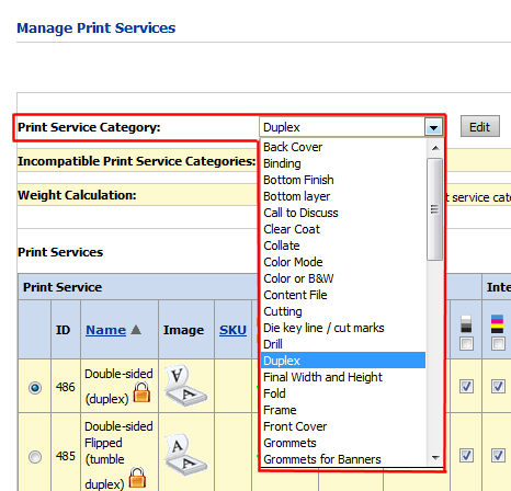2 To make an entire print service category incompatible with the selected category (i.e., if you want to disable all binding options when a buyer selects any stapling print service, and vice versa):