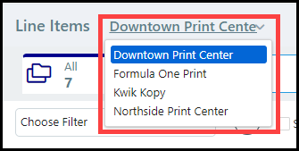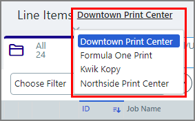 Output device associated with the job. To filter this attribute: In the column header field, select an option from the drop-down list. You can edit this attribute for each line item by clicking the pencil icon in the field and selecting an option from the drop-down list. |
