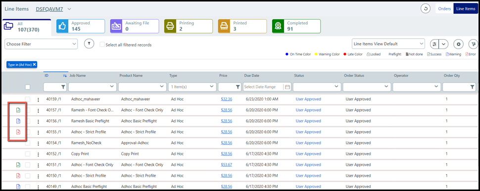 ● If the administrator enables preflighting in the product creation process (see Create Products), the system will automatically run a preflight check on the job files upon submission. An icon will show up in the Operator View next to the appropriate line item denoting whether the preflight check yielded a Success, Warning, or Error.