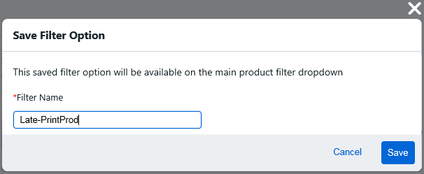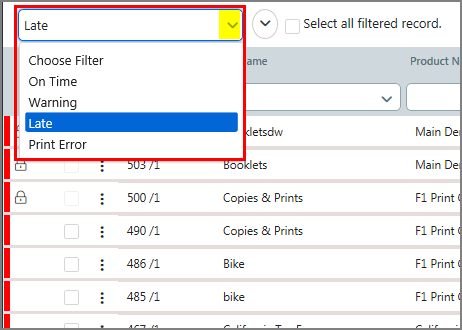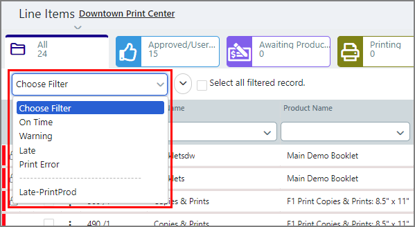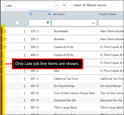 ● Alphabetical value data columns (e.g., Job Name, Product Name, Document, etc.) can be filtered with like searches and will automatically begin filtering with every entered character. For example, a search for fold will return all job names that include the characters fold (i.e., fold, folders, folding, foldy, etc.). Removing Filters ● To
