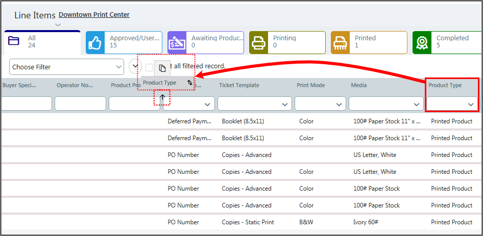 Type of product. To filter this attribute: In the column header field, select an option from the drop-down list to show only Printed Product or Non Printed Products. |