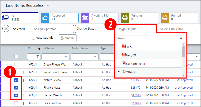The Operator View is a central command station for operators and other job managers. The page provides job operators and administrators with a single access point for every job in the system. Designed to enhance productivity and streamline job management operations, the Operator View lets operators create personalized views to suit every workflow. Sophisticated search, sort, and filtering capabilities help operators zero in on just the jobs they need to process and perform bulk job management tasks in a single operation.