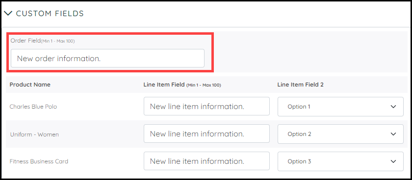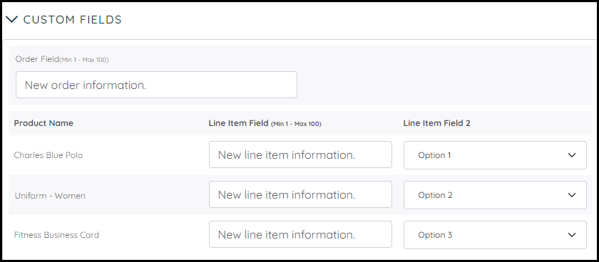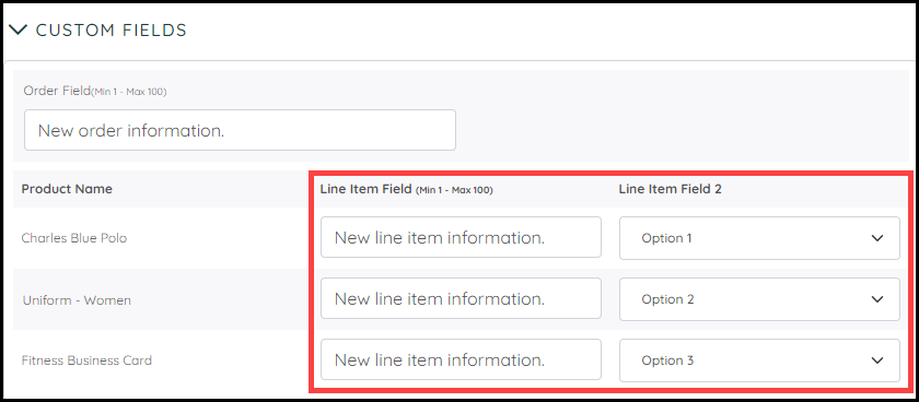 ● Field(s) assigned to the Line Item will be applied to each line item in the order.