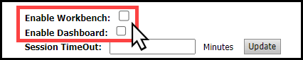 The Enable Dashboard and Enable Workbench check-boxes will only be available for the system administrator.